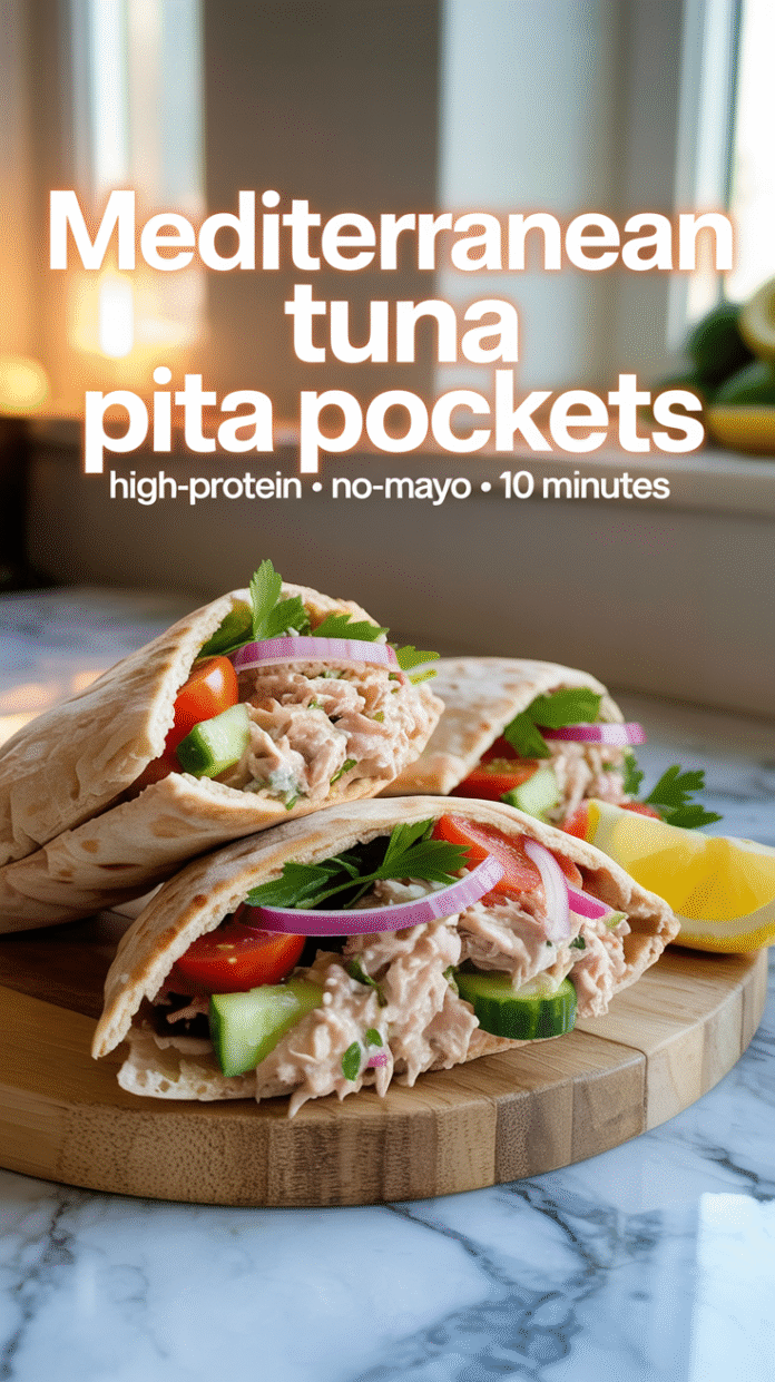 Meet your new go-to lunch: creamy, no-mayo Mediterranean tuna salad made with Greek yogurt and tahini, tucked into warm whole-wheat pitas with crisp cucumber and juicy tomatoes. It’s high protein, big on flavor, and comes together in just 10 minutes—perfect for busy weekdays and meal prep.
